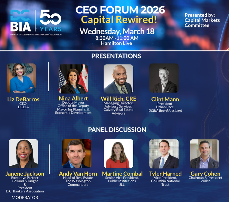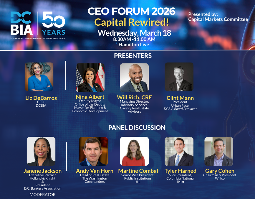 Over the years, DCBIA has achieved a prominent position in the local business community as an advocate for a vigorous, responsible real estate industry. It interprets that advocacy role broadly – to not only give voice to the specific concerns of its members, but also to speak out in support of public policies that promote the economic growth and vitality of the nation’s capital.